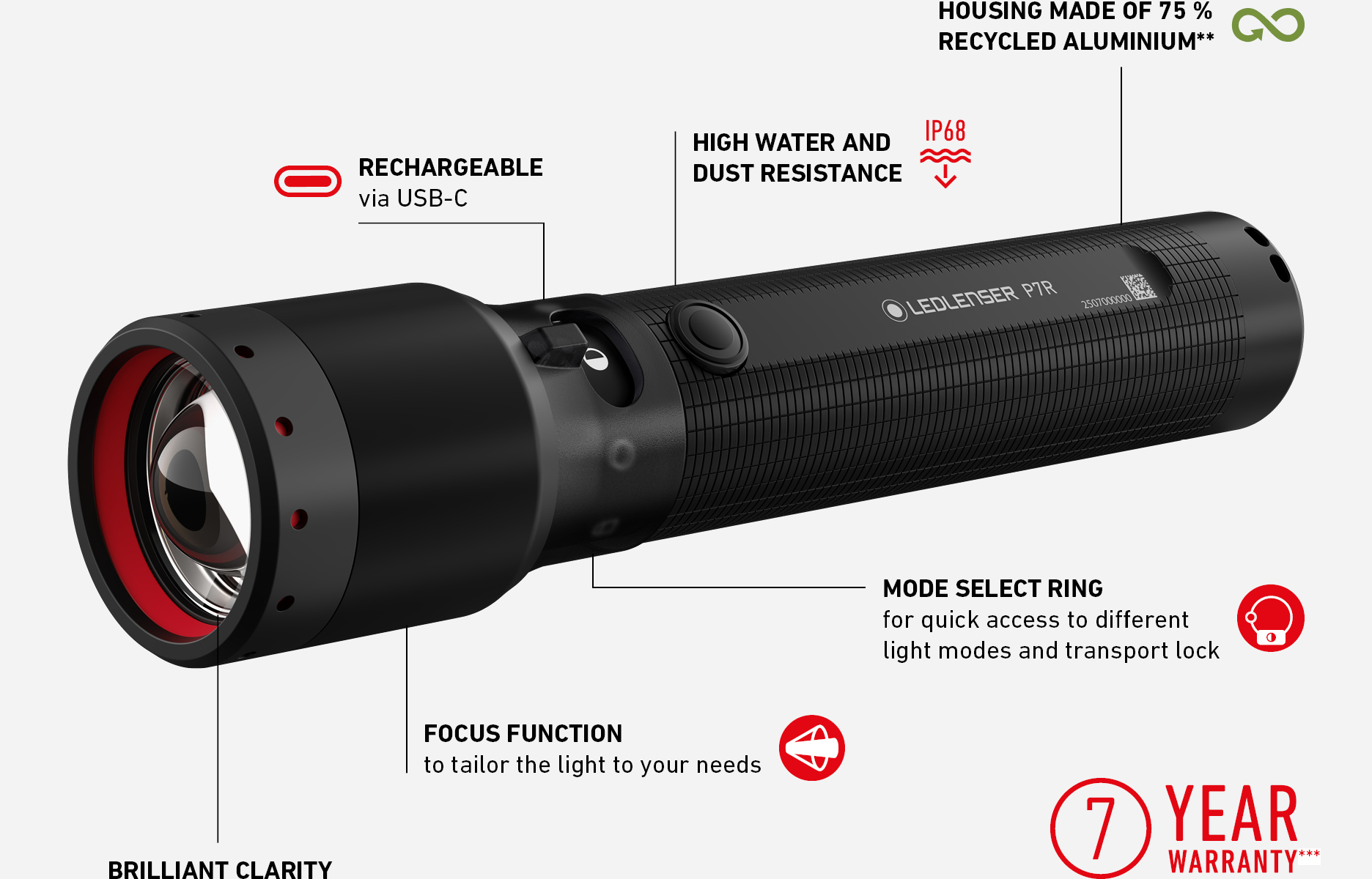 Kampiranje, planinarenje, sitni popravci kod kuće ili profesionalna primjena: P7R je idealna višenamjenska svjetiljka. Vjerna Ledlenser tradiciji, ima briljantnu kvalitetu i jačinu svjetla, kao i funkciju fokusiranja za lako podešavanje prema tvojoj potrebi. Korištenjem Mode Select prstena jednostavno mijenjaš različite načine rada, a tu su i transportna blokada te USB-C priključak za punjenje. I na kraju – svi aluminijski dijelovi izrađeni su od 75 % recikliranog materijala.